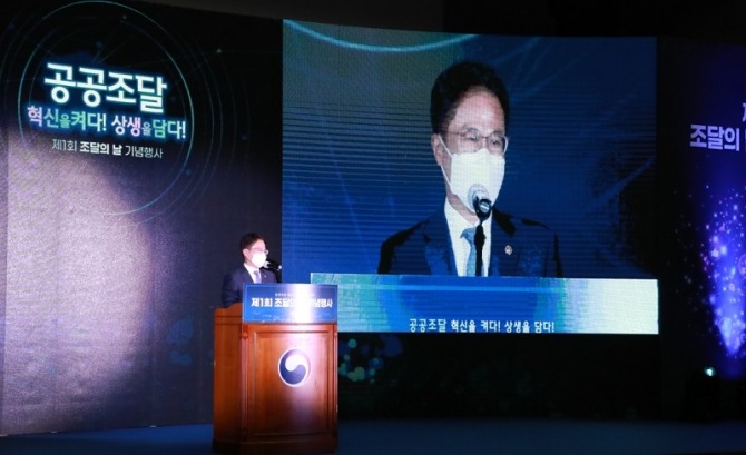이날 세종시 정부세종컨벤션센터에서 열린 '제 1회 조달의 날’ 기념행사에는 코로나19 방역지침을 준수해 김부겸 국무총리, 안도걸 기획재정부 제2차관, 서승원 중기중앙회 부회장 등 소규모 인원이 참석했다.