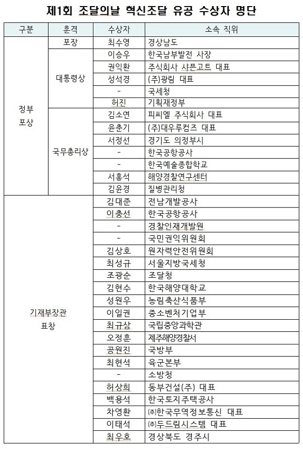 ‘혁신제품 사전검토 확인제’ 등 혁신조달 확산에 기여한 경남조달청 최수영 사무관이 정부포상 근정포장을 받았다. 정부포상 대통령상은 혁신조달 패키지 지원사업으로 혁신기업 발굴과 육성에 힘써온 한국남부발전, 소방분야 혁신제품을 개발한 주식회사 샤픈고트, 특장차 분야 기술로 해외수출 성과를 이룬 ㈜광림에게 나란히 수여됐다.