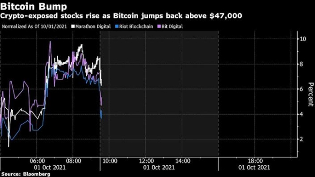 이미지 확대보기비트코인이 현지시각 1일 10%에 달하는 점프로 4만7,000 이상으로 급등하며 새로운 달을 시작한 가운데 암호화폐 관련 주식들도 일제히 상승했다. 마리톤 디지털(Marathon Digital Holdings), 라이엇 블록체인(Riot Blockchain) 및 비트 디지털(Bit Digital)은 모두 금요일에 3% 이상 상승했다.