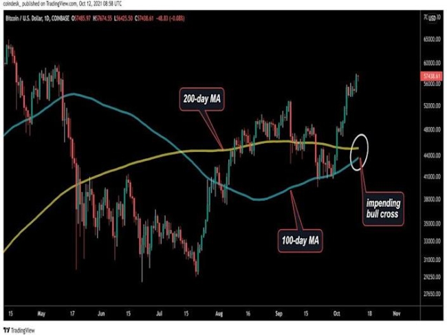 기술적 전망은 100일 및 200일 이동 평균(MA)이 16개월 만에 처음으로 향후 며칠 내에 강세 크로스오버를 찍을 궤도에 오르면서 강세 온체인 데이터와 일치하는 것으로 보인다. 황소 크로스오버는 특정 이동 평균이 상대적으로 더 많은 수의 과거 데이터를 추적하는 다른 평균 위로 교차할 때 발생한다. 100일 및 200일 이동 평균의 상승은 장기 강세장을 나타내는 것으로 널리 받아들여지며, 곧 더 강력한 차트 주도 매수 압력을 유발할 수 있다.