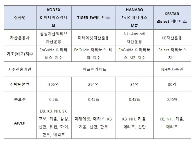 해당 ETF는 ‘KODEX K-메타버스액티브’, ‘TIGER Fn메타버스’, ‘HANARO Fn K-메타버스MZ’, ‘KBSTAR iSelect 메타버스’다.