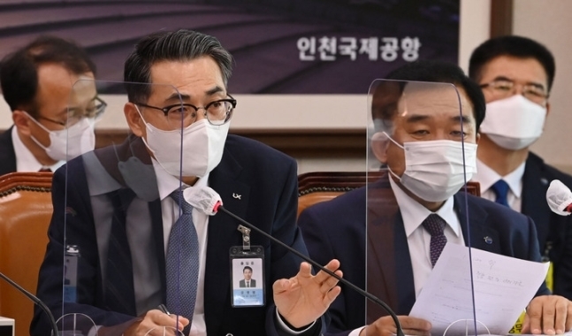 한국국토정보공사(LX공사) 김정렬 사장(왼쪽)이 14일 서울 여의도 국회에서 열린 국토교통위원회 국정감사에서 발언하고 있다. 사진=뉴시스 공동취재사진 이미지 확대보기