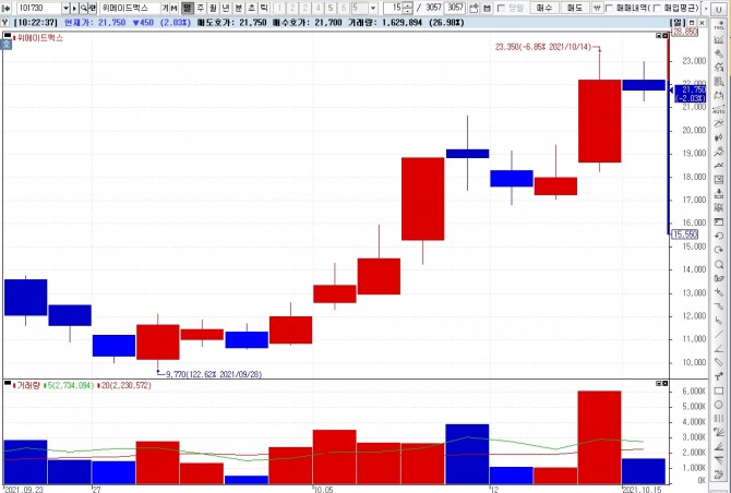 코스닥 상장사 위메이드맥스는 지난달 30일 주가 1만650원에서 15일 2만1700원으로 보름동안 104.23% 급등해 상장기업 중 가장 높은 주가 상승률을 기록했다.