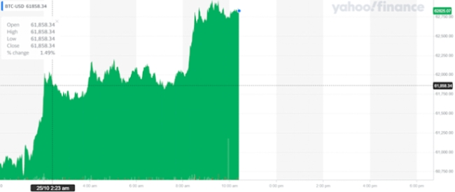 사상최고치 이후 하락세로 반전됐던 비트코인이 25일 6만3000달러 가까이 반등했다.