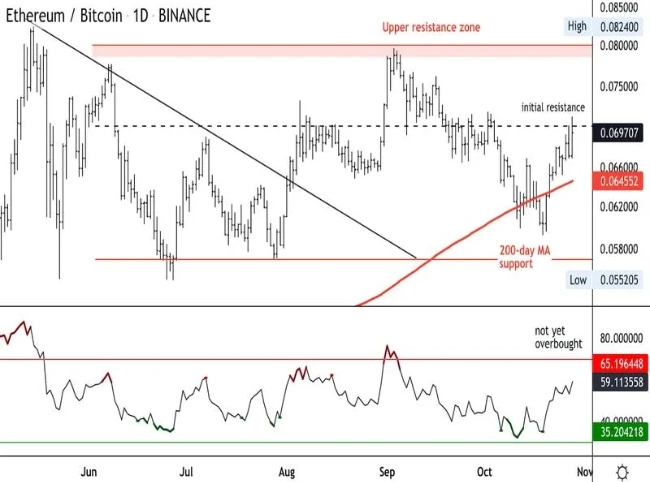 시가 총액 기준으로 세계에서 두 번째로 큰 암호화폐인 이더리움(Ether)은 목요일에 4,000달러를 다시 넘어섰다. 이더리움은 지난 24시간 동안 약 4% 상승하여 비트코인보다 상승률이 높았다. 아래 차트는 현재 0.069 저항을 테스트 중인 ETH/BTC 비율을 보여준다. 이 저항은 이더리움이 이전에 비트코인보다 뒤처진 수준이다. 그러나 지표는 비율이 아직 ‘과매수’ 상태가 아님을 시사하며, 이는 ETH/BTC가 앞으로 며칠 동안 0.08을 향해 더 상승할 수 있음을 의미한다.