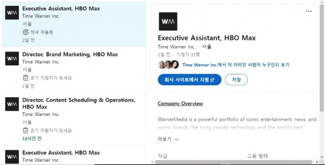 이미지 확대보기29일 업계에 따르면 워너미디어가 HBO맥스 코리아에서 일할 직원을 채용하는 공고를 채용정보사이트 링크드인에 올렸다. 총 30여개 등록된 채용공고는 모두 서울에서 근무하는 조건을 두고 있다.