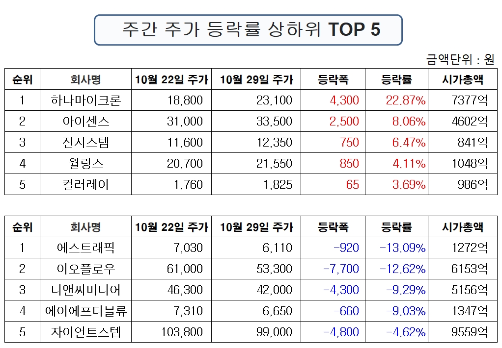 1위 하나마이크론 2만3100원 +4300원 (22.87%) ▲2위 아이센스 3만3500원 +2500원 (8.06%) ▲3위 진시스템 1만2350원 +750원 (6.47%) ▲4위 윌링스 2만1550원 +850원 (4.11%) ▲5위 컬러레이 1825원 +65원 (3.69%)