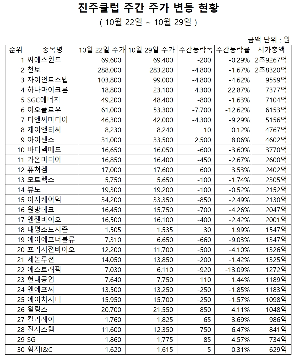 '진주클럽' 전체 시가총액은 지난 22일 기준 13조7746억 원에서 한주간 1510억 원(1.1%) 감소해 29일 기준 13조6236억 원을 기록했다.