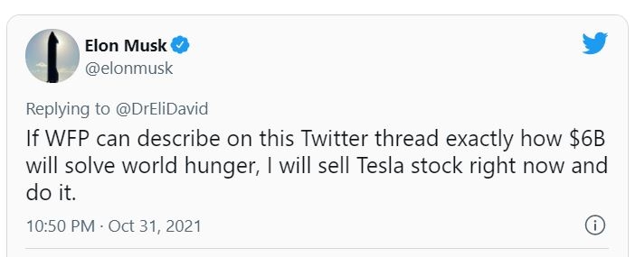 이미지 확대보기앞서 데이비드 비즐리(David Beasley) 유엔세계식량계획(WFP) 사무총장이 지난 달 초 트위터를 통해 머스크와 같은 억만장자들에게 "일회적으로 지금 나서달라"고 요청했다.