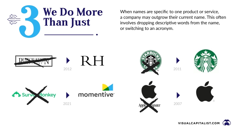 애플과 스타벅스가 대표적인 경우로 애플은 당초 상호가 ‘애플 컴퓨터’였으나 사업 영역이 PC 외에 다양한 전자제품으로 확대되면서 컴퓨터 업체로 좁게 이해되는 것을 피하기 위해 이름을 줄이는 선택을 했다. 스타벅스 역시 원래는 ‘스타벅스 커피’란 이름을 썼지만 글로벌 체인으로 성장하면서 단순히 커피 매장으로 협소하게 인식되는 것에서 벗어나기 위해 커피란 이름을 삭제했다.