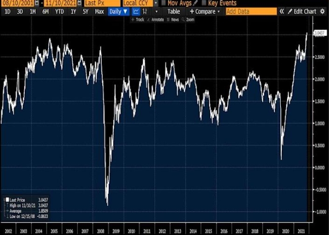 한편 주식 시장이 스트레스의 징후를 거의 보이지 않는 가운데 이러한 추세는 이어질 것으로 보인다. 미국 대형 주식 S&P500 지수와 관련된 선물 계약은 보도시간 기준 0.2% 하락했다. 전통적인 인플레이션 헤지 수단인 금은 5개월 최고치인 1,853에서 거래되며 1,830달러의 장기 저항선을 돌파했다. 블룸버그에 따르면 채권 시장 지표에서 파생된 향후 5년 동안의 인플레이션 기대치를 나타내는 미국의 5년 ‘손익 분기율’이 지난 2001년 이후 20년 만에 가장 높은 3%를 넘어섰다.