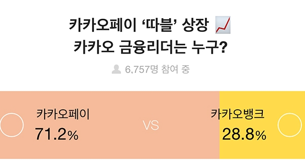 6757명이 참여한 "카카오페이 '따블' 상장, 카카오 금융리더는 누구?" 설문에서 71.2%는 '카카오페이', 28.8%는 '카카오뱅크'를 선택했다.