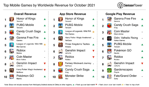 크래프톤이 개발하고 텐센트가 서비스 중인 '배틀그라운드 모바일', 킹 스튜디오 '캔디 크러시 사가', 가레나 '프리 파이어' 등이 왕자영요의 뒤를 이었으나, 셋 모두 월 매출이 2억 달러에 미치지 못했다.