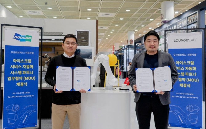 두산로보틱스는 라운지랩과 ‘협동로봇 솔루션 활성화와 아이스크림 서비스 자동화 시스템을 위한’ 업무협약(MOU)을 체결했다고 15일 밝혔다.