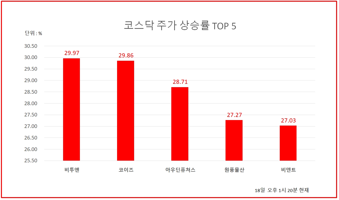 1위 비투엔 3860원 ( 29.97% ), 2위 코이즈 2305원 ( 29.86% ), 3위 아우딘퓨쳐스 1995원 ( 28.71% ), 4위 원풍물산 1470원 ( 27.27% ), 5위 비덴트 23500원 ( 27.03% ), 6위 큐캐피탈 658원 ( 23.45% ), 7위 다날 13300원 ( 23.15% ), 8위 위지트 1805원 ( 17.21% ), 9위 플래티어 28500원 ( 17.04% ), 10위 미투온 8670원 ( 16.22% )