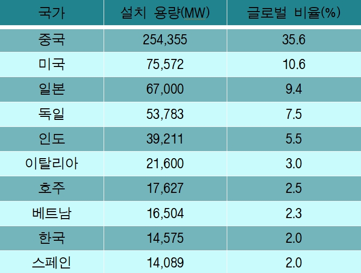 호주는 인구 2600만 명으로 상대적으로 낮지만 1인당 순위는 1위다. 호주 대륙은 모든 대륙에서 가장 많은 양의 태양 복사를 받고 있으며, 호주 가정의 30% 이상이 현재 옥상 태양광 PV시스템을 갖추고 있다.