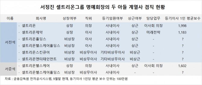금융감독원 전자공시시스템에 따르면 서진석 이사회 의장은 셀트리온 이외에도 셀트리온그룹의 셀트리온제약, 셀트리온홀딩스, 셀트리온헬스케어홀딩스, 셀트리온스킨큐어, 셀트리온엔터테인먼트 등 5개 계열사의 임원을 겸직하고 있습니다.