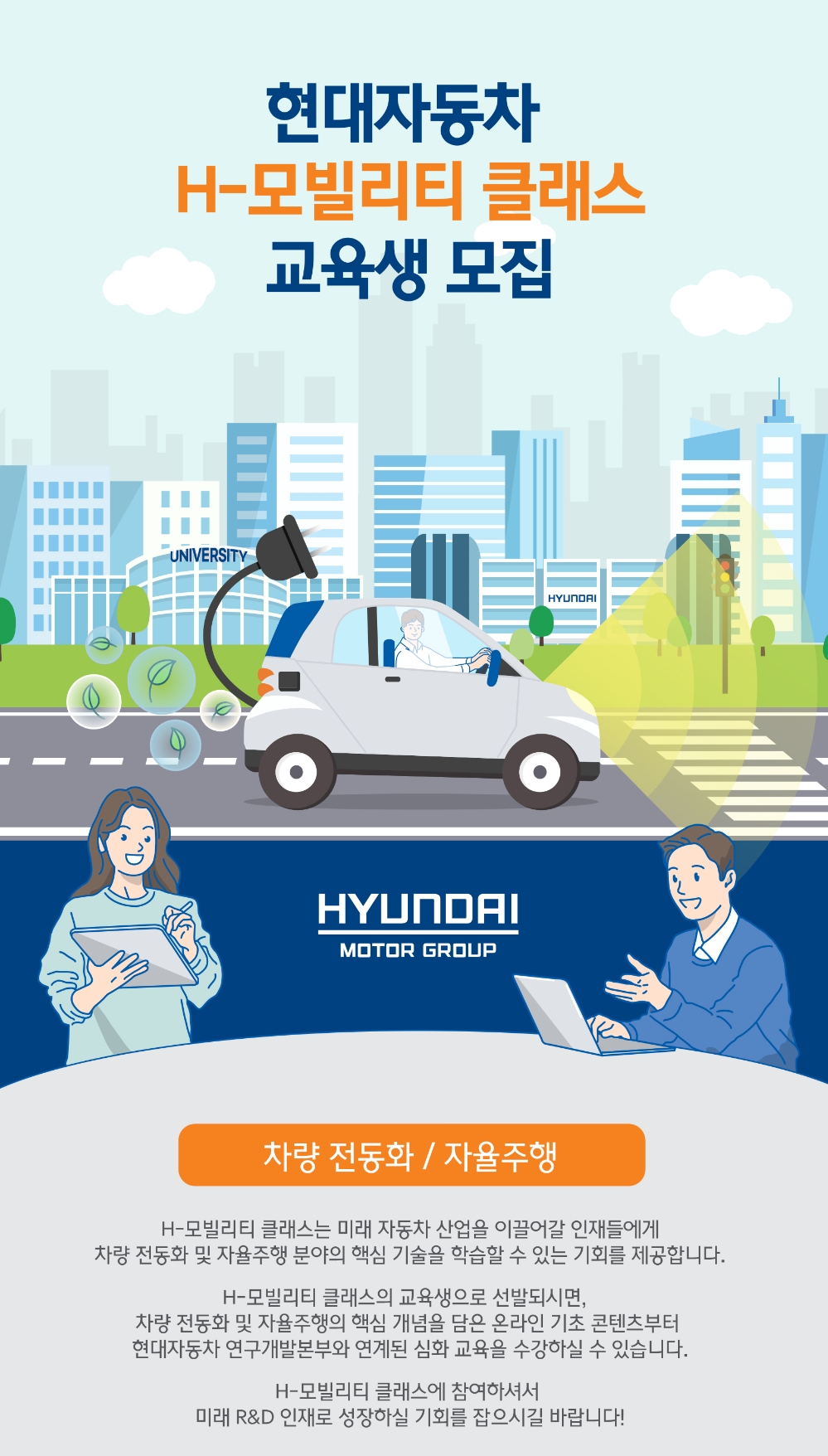 이미지 확대보기현대차는 차량 전동화와 자율주행차 분야에서 국가경쟁력을 강화하기 위해 ‘H-모빌리티 클래스’ 참가자를 모집한다고 24일 밝혔다.