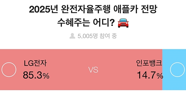 이번 설문조사에서 5005명이 참여한 "2025년 완전자율주행 애플카 전망…수혜주는 어디?" 설문에서 85.3%는 'LG전자', 14.7%는 '인포뱅크'를 선택했다.