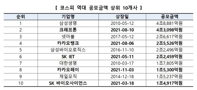 특히 역대 공모금액 상위 10개사 중 5개사가 올해 신규 상장한 기업인 것으로 나타났다. 해당 기업은 크래프톤과 카카오뱅크, SK IET, 카카오페이, SK바이오사이언스 등이다.