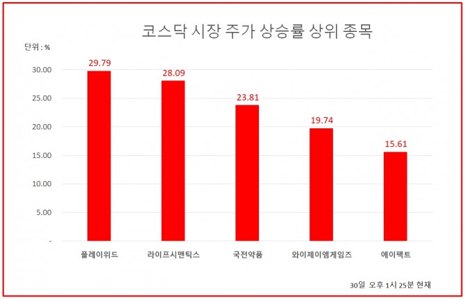 30일 오후 1시 25분 현재 코스닥시장 주가상승률 상위 30개 종목은 다음과 같다.