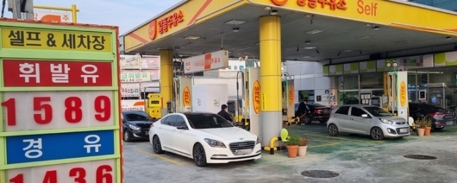 11월 15일 충부 청주의 한 알뜰주유소에서 휘발유를 리터당 1589원에 판매하고 있는 모습. 사진=뉴시스 이미지 확대보기