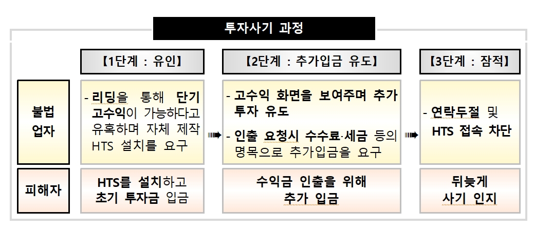 투자중개형은 사설 홈트레이딩시스템(HTS)을 통해 거래가 이뤄지는 것처럼 가장해 입금받은 투자금을 편취하는 수법을 사용했다. HTS 화면상 고수익이 난 것처럼 보여준 뒤 투자자가 출금을 요청하면 수수료, 세금 등 각종 명목으로 추가 자금을 입금받은 후 잠적하기도 했다.