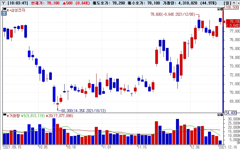 이미지 확대보기16일 한국거래소에 따르면 삼성전자 주가는 오전 10시 현재 전날 보다 0.64% 상승한 7만8000원에 거래되고 있다.