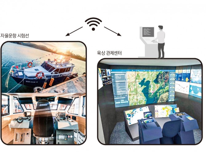 자율운항 시험선 단비(왼쪽)와 육상관제센터 모습. 사진=대우조선해양이미지 확대보기