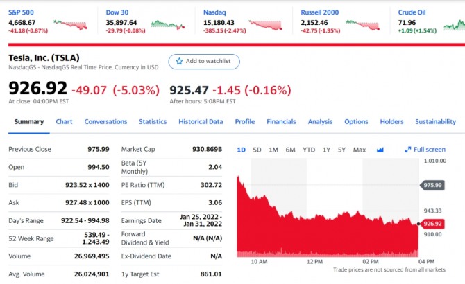 미국 뉴욕증시 기술주 폭락을 몰고온 테슬라 주가