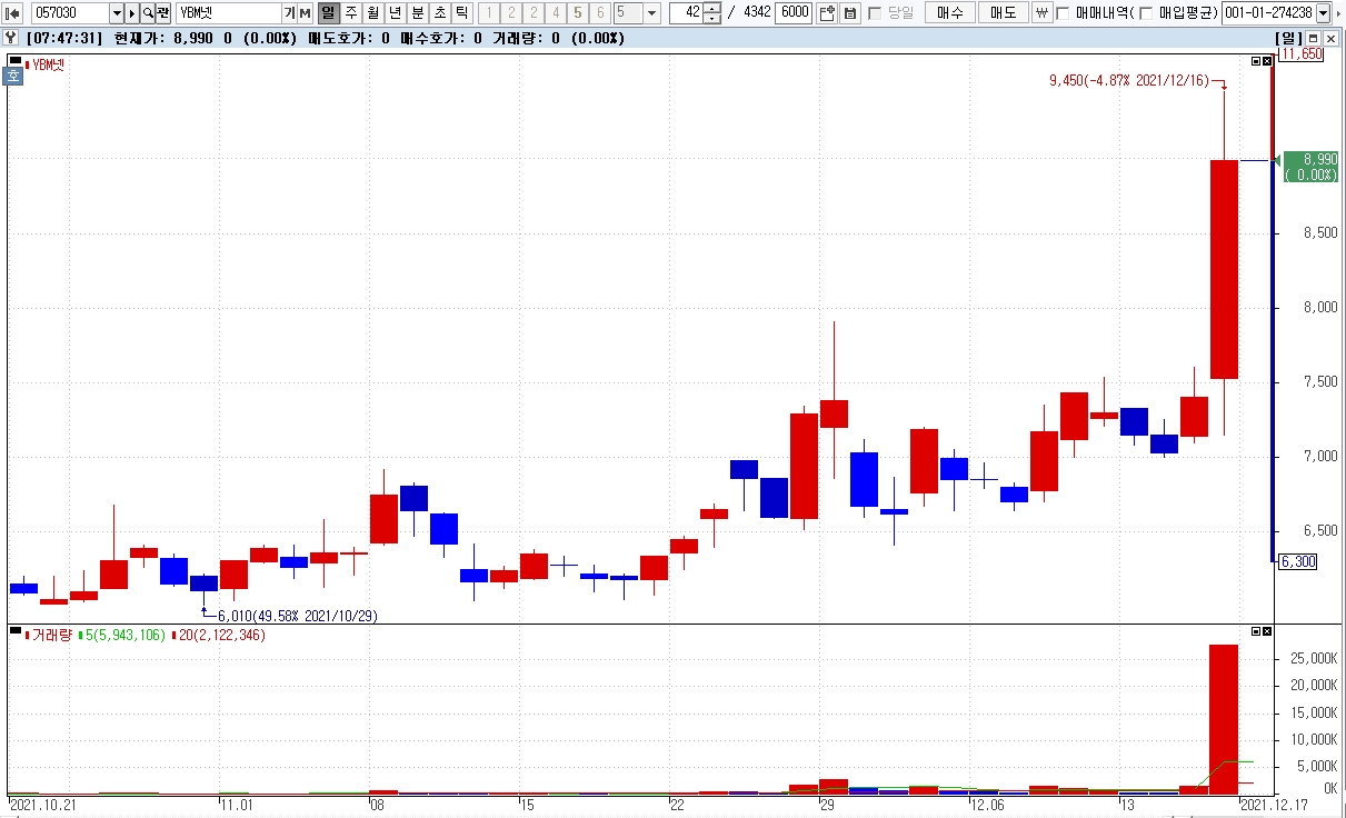 이미지 확대보기17일 한국거래소에 따르면, YBM넷 주식은 16일 코스닥 시장에서 상장주식수 대비 거래량 비율이 169%로 가장 높았으며, 이날 주가는 전거래일 보다 21.49% 상승한 8990원으로 마감했다.