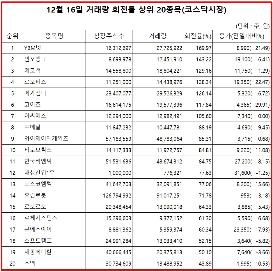 이미지 확대보기16일 주식시장에서 코스닥 종목의 거래량 회전율 기준 상위 종목은 다음과 같다.