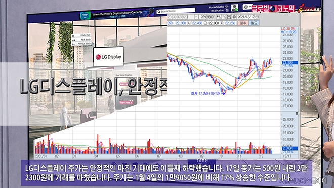 LG디스플레이 주가는 안정적인 마진 기대에도 이틀째 하락했습니다. 17일 종가는 500원 내린 2만2300원에 거래를 마쳤습니다. 주가는 1월 4일의 1만9050원에 비해 17% 상승한 수준입니다.