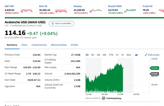 이런 가운데 아발란체(Avalanche, AVAX)만 '나홀로 상승세'를 보이고 있어 주목받고 있다.아발란체는 이더리움(Ethereum, ETH)의 대체재로 주목받고 있다. 아발란체(Avalanche)는 최근 도지코인(DOGE) 과 테라(LUNA,) 그리고 폴카닷(DOT)을 제치고 일약 가상화폐 9위에 올랐다. 암호화폐 전문매체 디크립토는 이날 아발란체 특집 기사를 냈다. 디크립토는 아발란체 가격 급등 요인으로 금융 서비스 회사 서클이 최근 7 발표한 USDC 스테이블 코인이 아발란체 네트워크를 공식 지원한다고 밝힌 것을 꼽고 있다. 스테이블코인은 블록체인 네트워크에서 애플리케이션을 사용하려는 사용자에게 더 쉬운 진입로를 제공하고 있다. 아발란체 블록체인은 고속 트랜잭션 처리와 탈중앙성을 특징으로 하는 스마트 계약 플랫폼이다. 벤처캐피탈들로 아발란체에 자금을 지원했다. 지난 9월에 폴리체인 캐피털과 쓰리애로우캐피탈은 아발란체 재단에 2억300만 달러를 제공했다.
