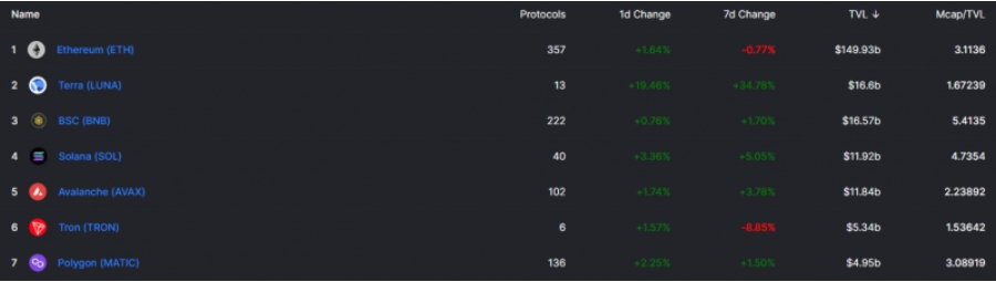 현재 이더리움의 TVL은 1499억3000만 달러로 1위를 기록했다. 테라는 166억 달러에 도달해 3위인 바이낸스 스마트 체인(BNB) 165억7000만 달러를 근소한 차이로 눌렀다.