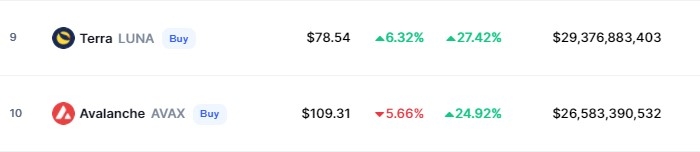 테라의 루나 토큰은 20일 아침 코인마켓캡에서 290억 달러 이상으로 시가총액 기준으로 9번째로 큰 암호화폐로 등극했다. 경쟁자인 아발란체(AVAX)는 265억 달러로 10위에 올랐다.