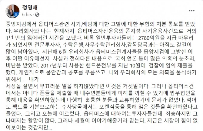 이미지 확대보기정 사장은 이날 페이스북에 "중앙지검에서 옵티머스관련 사기, 배임 고발에 대한 무혐의 처분 통보를 받았다'며 "회사와 나는 현재까지 옵티머스자산운용의 폰지성 사기운용사건으로 거의 1년 반 동안 잃어버린 시간을 보냈다"고 전했다.