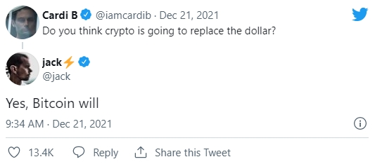 카디 비는 도시가 "그렇다, 비트코인이 할 것이다"고 답한 댓글에서 암호화폐가 미국 통화를 대체할 수 있을지에 대해 폭넓게 물었다.