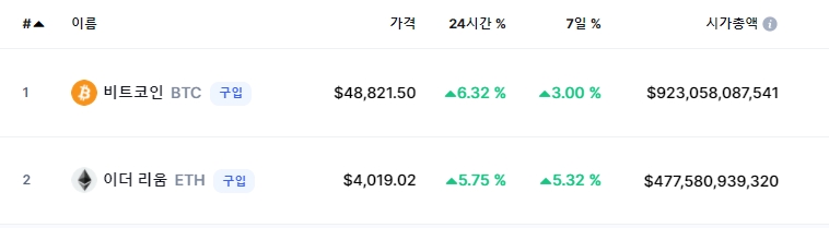 이날 코인마켓캡(CoinMarketCap) 데이터에 따르면 비트코인 가격은 7% 이상 상승해 4만9010 달러로 장중 최고가를 기록했다. 21일 밤 10시 32분 코인마켓캡 기준 6.32% 상승한 4만8821.50달러, 이더리움(ETH)은 5.75% 오른 4019.02달러, 도지코인(DOGE)은 4.12% 오른 0.17달러다. 리플(XRP)은 6.52% 상승해 0.8911달러가 됐다.