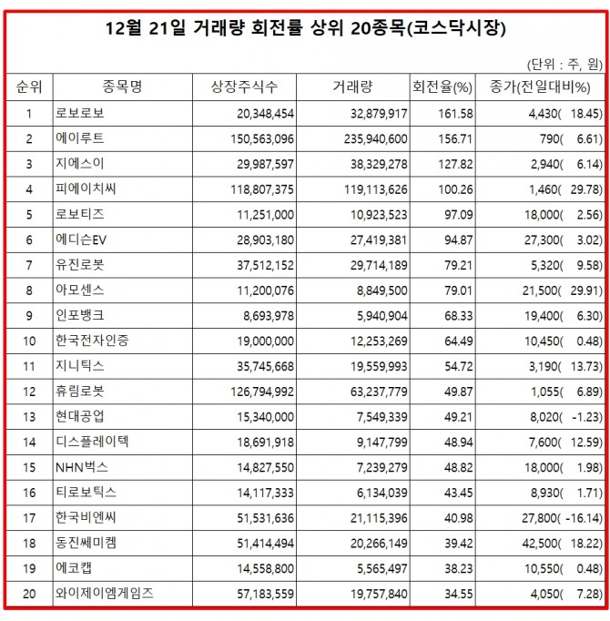 이미지 확대보기22일 한국거래소에 따르면, 로보로보 주식은 21일 코스닥 시장에서 상장주식수 대비 거래량 비율이 161%로 가장 높았고, 주가도 18.45% 급등하며 4430원으로 마감했다.