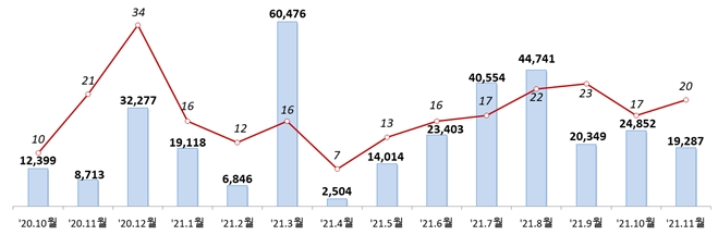 22일 금융감독원이 발표한 ‘11월 중 기업의 직접 금융 조달 실적’에 따르면 지난달 주식 발행액이 1조9287억 원으로 전월 대비 22.4%(5565억 원)줄었다. 다만 주식과 회사채를 합한 총 발행실적은 19조4510억 원으로 같은 기간 1.6%(3003억 원) 증가했다. 이 중 주식 발행액의 감소는 유상증자가 늘었음에도, 대규모 기업공개(IPO)가 없어 발행 규모가 크게 축소된 영향이다.