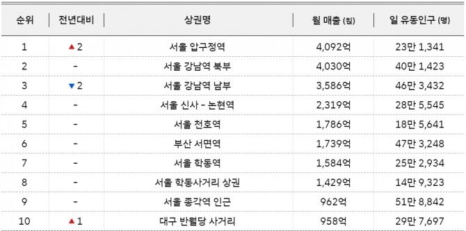 압구정역 상권은 2021년 하루 평균 136억 원의 매출을 기록했다. 일 평균 유동인구는 23만명으로 전국 31위 수준이지만, 유동인구당 매출 기준으로는 약 5만9000원으로 국내에서 가장 높았다.