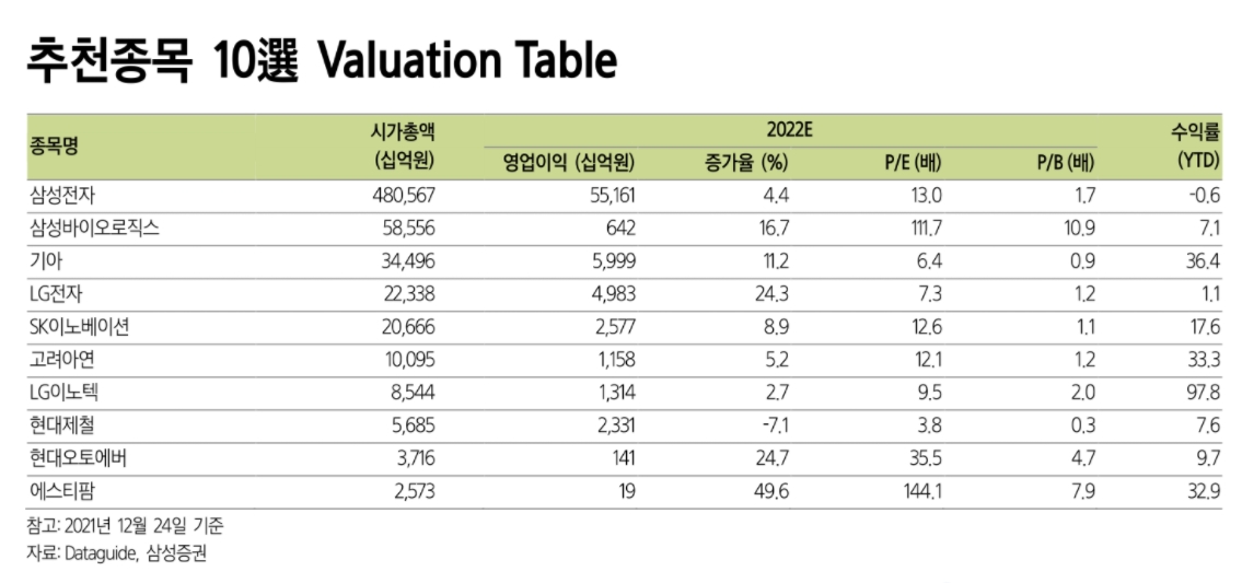 삼성증권은 26일 주간 전략보고서에서 2022년 투자아이디어로 전차(電車)군단, 모빌리티, 바이오 CMO를 꼽았다.