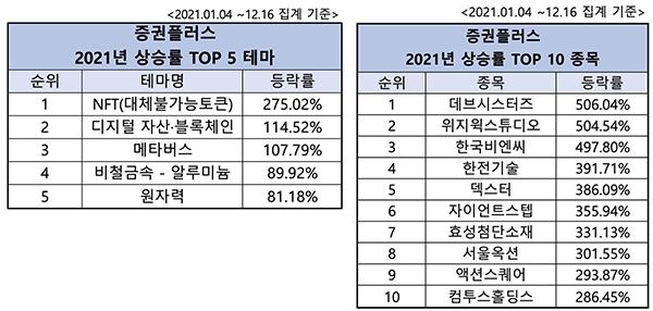 올해 주식 시장에선 'NFT' 테마의 강세가 단연 돋보였다. NFT가 대중에게 본격적으로 알려진 것은 불과 1년도 채 되지 않았지만 275.02% 오르며 올 한해 가장 높은 상승률을 보였다.