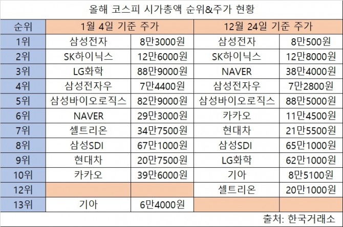 올해 네이버와 기아 주주들은 크게 웃었으나 LG화학과 셀트리온 주주들은 피눈물을 흘린 것으로 나타났다. 10위권 안으로 진입한 기아