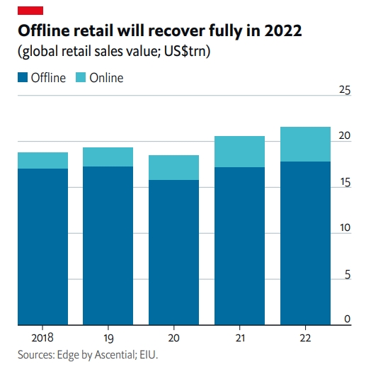 보고서는 “코로나19 예방 백신 접종률이 더 높아지고 코로나 방역과 관련한 봉쇄조치가 완화되면서 전세계 소비자들이 코로나 사태 이전 수준으로 본격적으로 소비 활동을 재개하면서 오프라인과 온라인 소매판매 모두 회복세를 이어갈 것으로 보인다”며 이같이 전망했다.