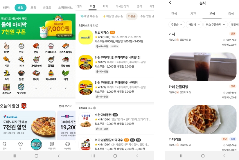 이미지 확대보기하단으로 드래그하면 ‘혼밥생활’, ‘감성이 튀는 브런치 메뉴’ 등 앱 에서 추천한 음식 주제 카테고리가 나타난다. 주제에 맞는 식당과 주력 메뉴가 나타난다. 추천 카테고리에는 알고리즘이 적용돼 해당 고객이 많이 주문하고 찾은 음식 위주로 나타난다. 이는 고객이 먹고 싶은 음식을 빠르게 주문하기보다, 리뷰나 카테고리의 추천 등을 통해 먹고 싶은 음식이나 맛집을 찾아보라는 인상을 줬다.