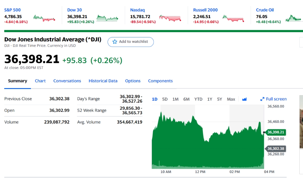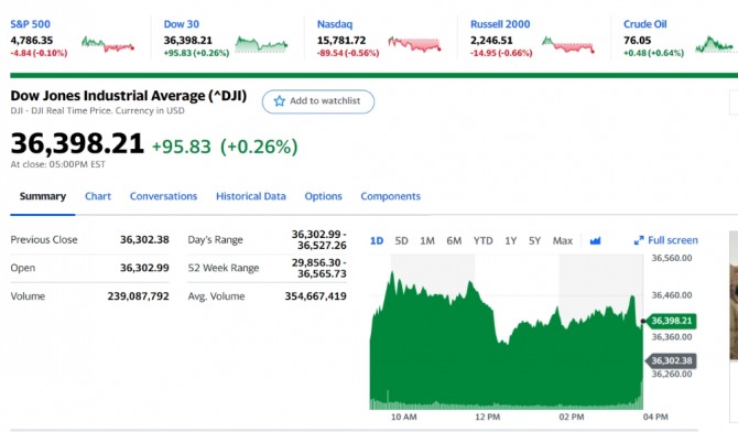 오미크론이 축복이 될 수 있다는 남아공 보고서가 나온 가운데 뉴욕증시는 연말 차익실현 매물에 기술주들이 하락하며 혼조세를 보였다. 뉴욕증권거래소(NYSE)에서 다우존스30산업평균지수는 전장보다 95.83포인트(0.26%) 오른 36,398.21로 거래를 마쳤다. 스탠더드앤드푸어스(S&P)500지수는 전장보다 4.84포인트(0.10%) 하락한 4,786.35를 나타냈고, 기술주 중심의 나스닥 지수는 전장보다 89.54포인트(0.56%) 하락한 15,781.72로 장을 마쳤다.