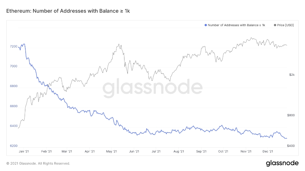 소위 고래의 수가 감소한다는 것은 가장 부유한 이더리움 지갑 소유자 사이에서 지속적인 판매 추세를 반영한다. 예를 들어, 최소 1만 ETH(약 3920만 달러)를 보유하고 있는 이더리움 주소의 수가 6월 1208개에서 12월 28일 1156개로 약 4.5% 감소했다.