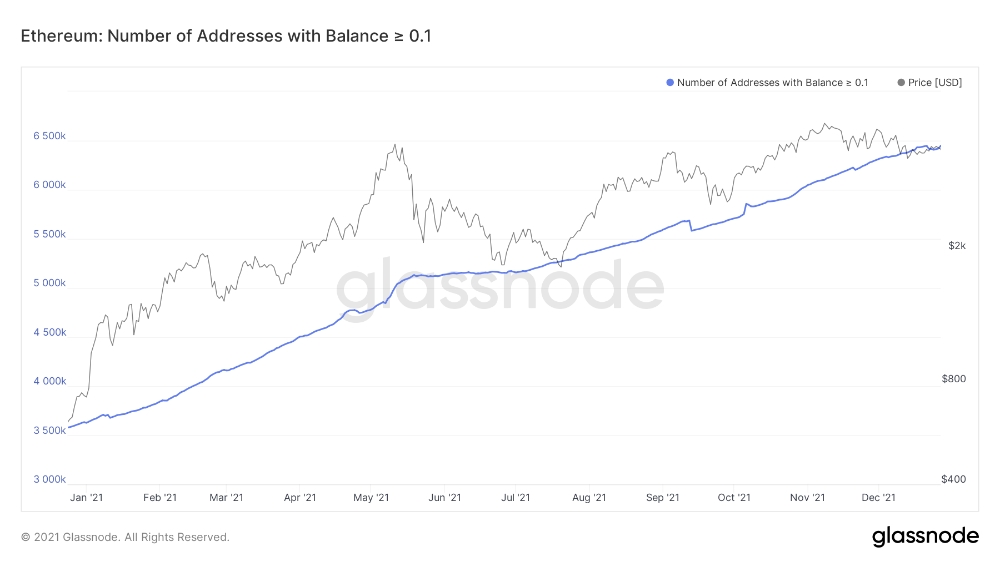 고래와 달리 ETH를 소량 보유하는 지갑은 2021년 이더리움 가격 랠리의 최전선에 있었다 .